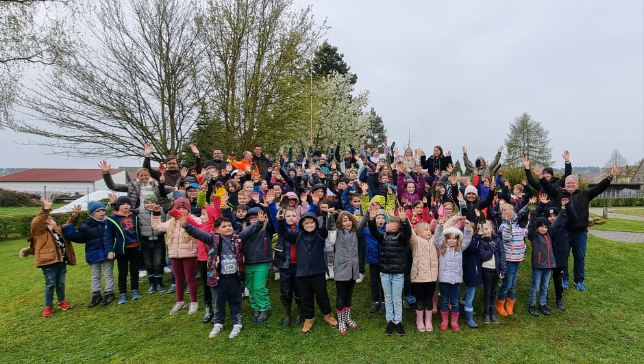 Unsere Grundschule nahm auch in diesem Schuljahr am Nachhaltigkeitswettbewerb der Sparkasse Ansbach teil und erhielt erfreulicherweise ein Preisgeld von stolzen 1.000 €. Dank vorhergehender fachmännischer Beratung und tatkräftiger Unterstützung durch unseren 2. Bürgermeister Herrn Bauer wurde am verregneten letzten April-Freitag die Pflanzaktion gestartet. Mitarbeiter des Bauhofes und der Firma Paulisch GmbH mit einem Minibagger halfen ebenfalls dazu, mit allen Schülern sechs heimische Laubbäume auf dem Wiesengelände verteilt zu pflanzen. Trotz der ungemütlichen, nasskalten Witterung waren unsere Schülerinnen und Schüler eifrig mit ihren Schaufeln dabei, die Pflanzlöcher wieder mit Erde zu füllen. Obwohl viele dabei gefroren haben und ziemlich schmutzig wurden, waren wohl letztendlich alle Kinder stolz, einen kleinen Beitrag zum Erhalt unserer schönen Natur geleistet zu haben.