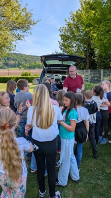 Dank der finanziellen Unterstützung durch die Gemeinde Lichtenau und dem Nachhaltigkeitswettbewerb der Sparkasse Ansbach, können wir auch in diesem Schuljahr wieder ein Honigbienenvolk auf unserem Pausenhof halten. Darüber hinaus kommt jede Klasse in den Genuss eines Projekttages mit unserem Imker Andreas Lingmann. Hier stehen dieses Mal die Wildbienen im Mittelpunkt. Die Kinder lernen verschiedene Wildbienenarten und ihre Lebensweise kennen. Anschließend können die Schüler mit farbigen Dias experimentieren, wie Bienen ihre Umwelt sehen. Um den Wildbienen zusätzliche Nahrung zu bieten, darf jede Klasse neben unserem neuen Wildbienenglück-Insektenhotel einen Strauch pflanzen. Durch diese Aktion wird den Kindern die Bedeutung der Bienen für unser Leben sowie die Schutzwürdigkeit dieser Tiere und ihrer Lebensräume vor Augen geführt. Vielen Dank an Herrn Lingmann für die kurzweiligen Projekttage!