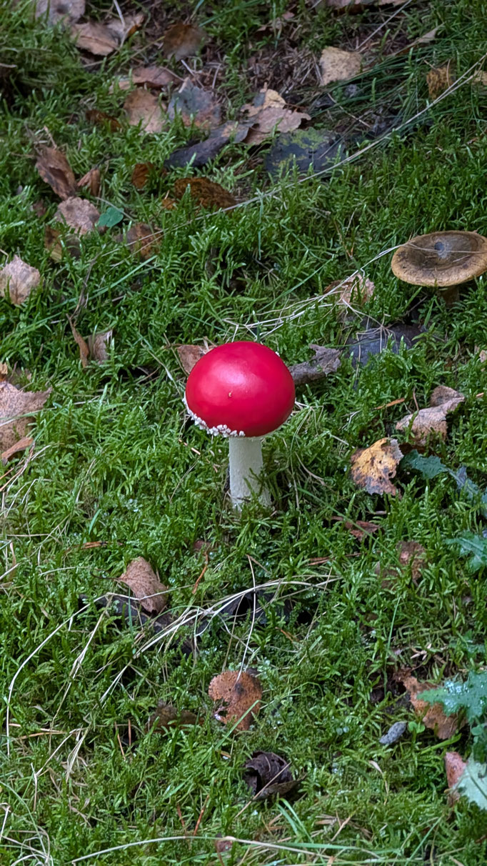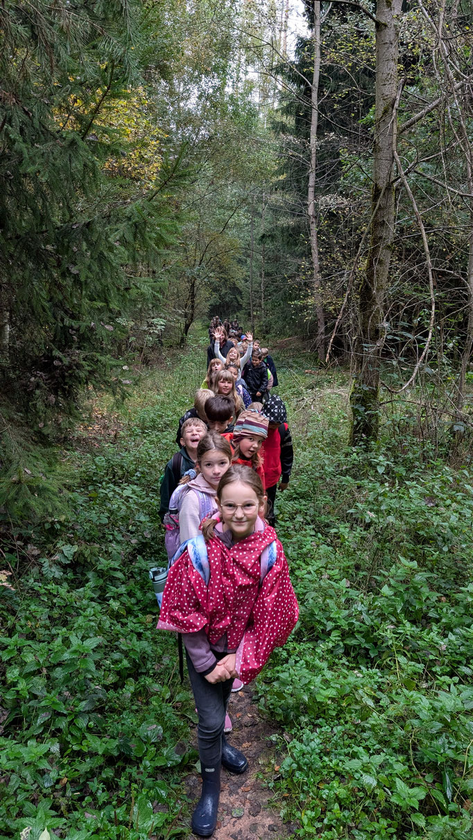 Die Wanderroute führte durch den herbstlichen Wald, vorbei an buntem Laub, duftendem Moos und vielen spannenden Entdeckungen. Besonders aufmerksam beobachteten die Kinder die Natur am Wegesrand: Überall gab es Pilze in den unterschiedlichsten Formen und Farben zu sehen.