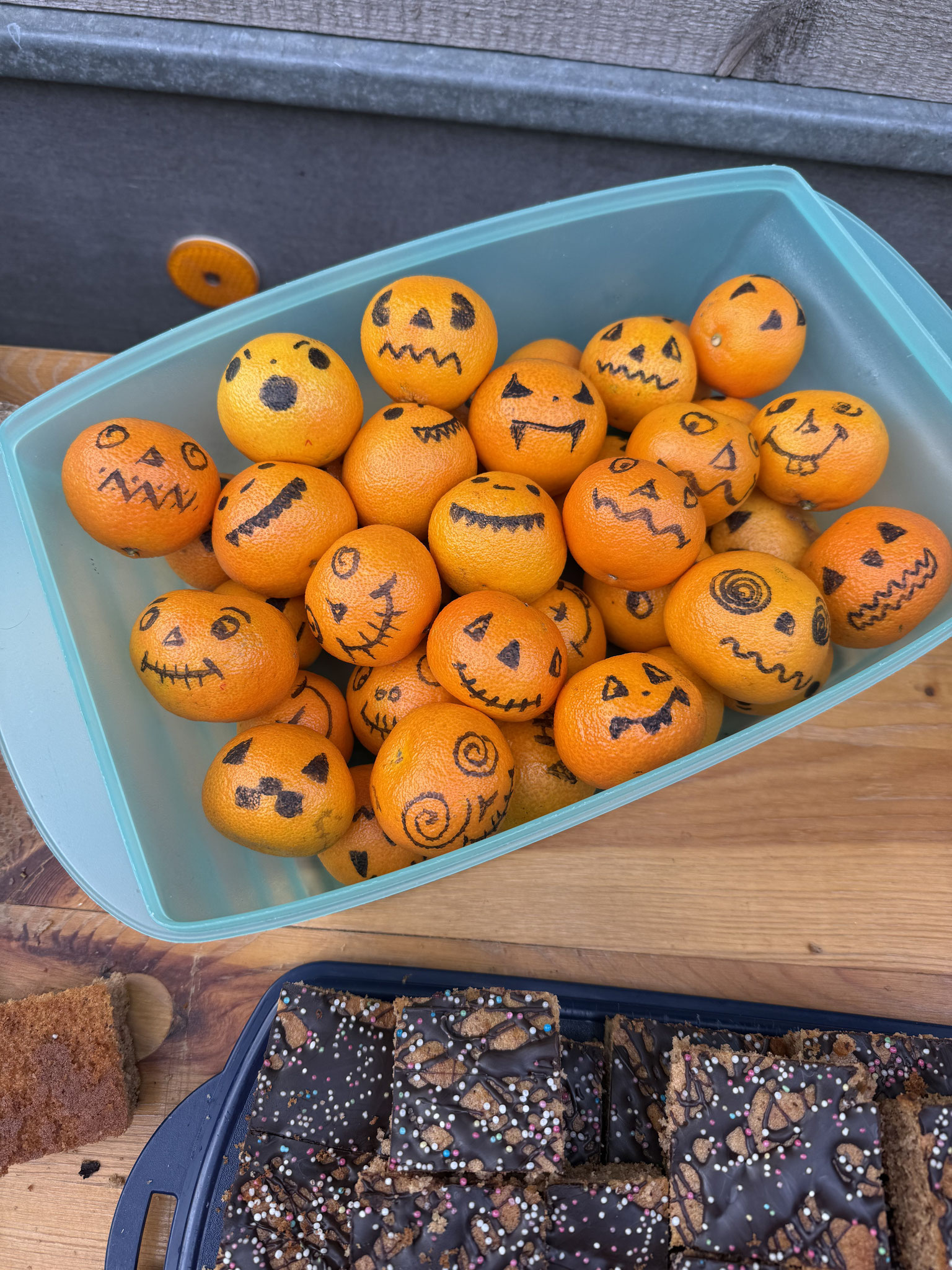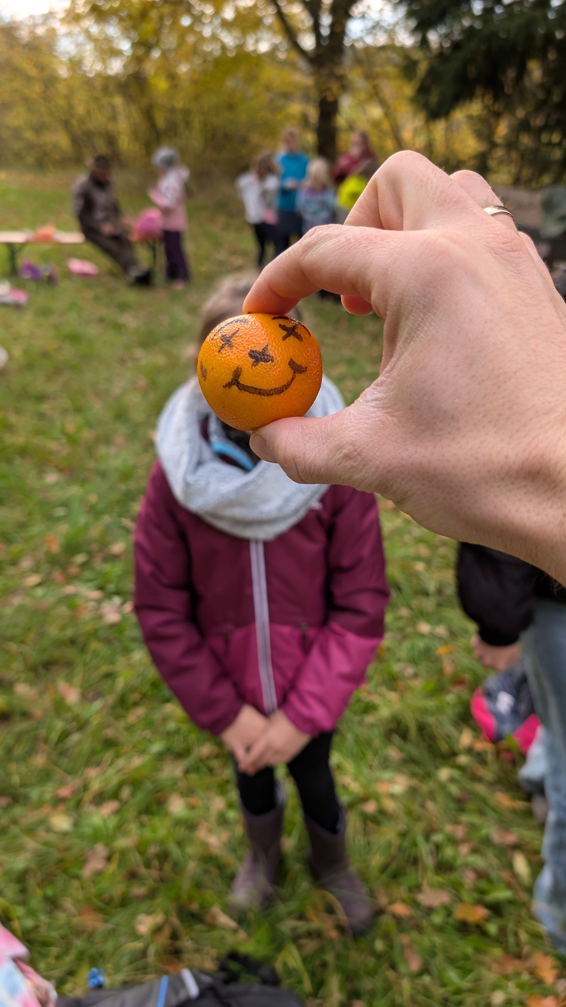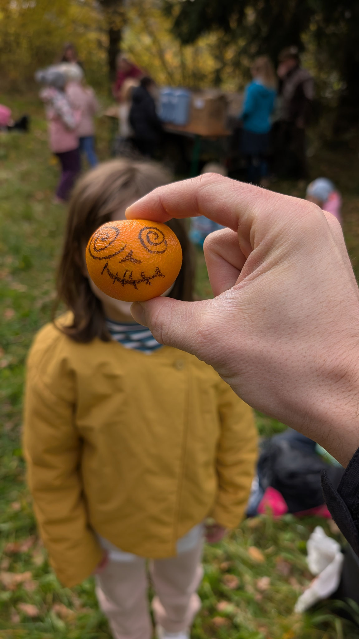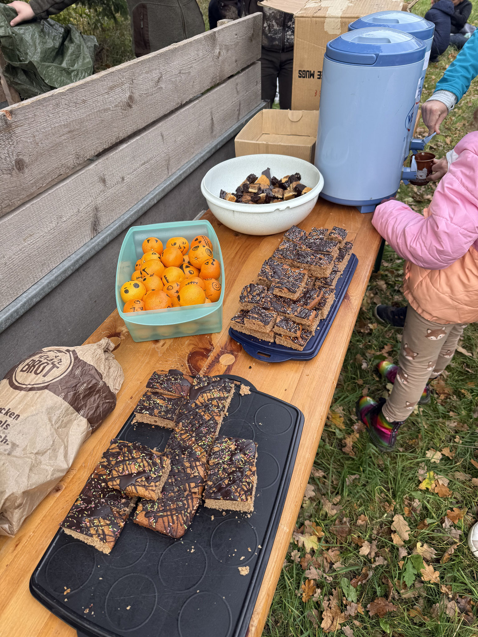 Nach der spannenden Entdeckungstour wartete eine liebevoll vorbereitete Stärkung auf die kleinen Naturforscher. Die Helferinnen hatten Sitzgelegenheiten aufgebaut und leckeren Kuchen, Nussecken sowie hübsch verzierte Mandarinen bereitgestellt. Dazu gab es warmen Kinderpunsch, der nach dem Spaziergang an der frischen Luft besonders gut schmeckte.