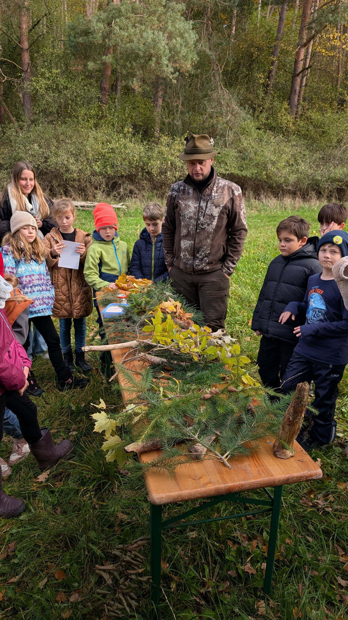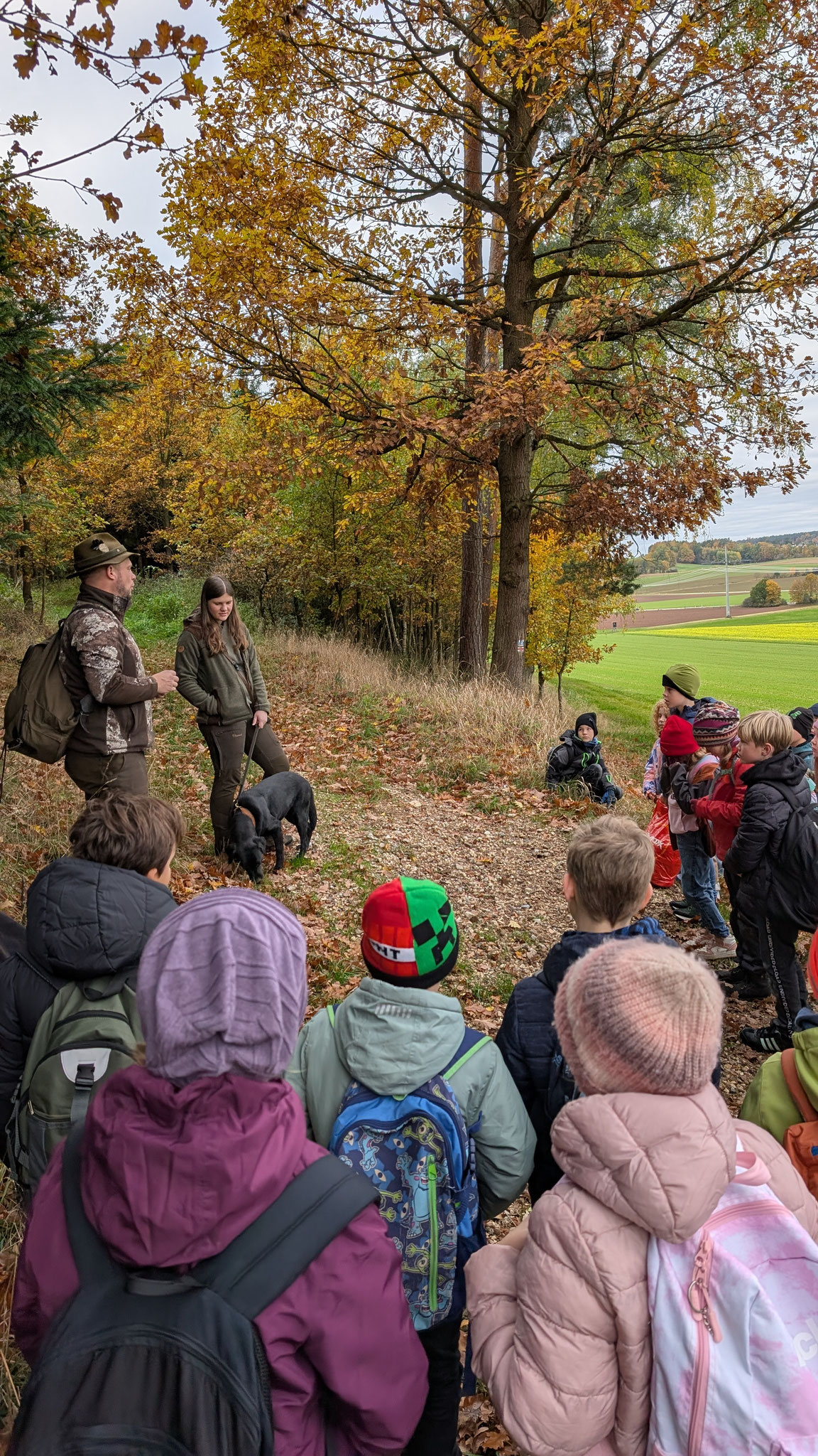 Am vergangenen Mittwoch machten sich die dritten Klassen der Grundschule Lichtenau auf den Weg nach Herpersdorf, um dort einen spannenden Vormittag im Wald zu verbringen. Begleitet wurden die Kinder von Jäger und Förster Herrn Nölp und seiner Tochter Katharina, die die Gruppe mit viel Wissen und Begeisterung durch den herbstlichen Wald führten.