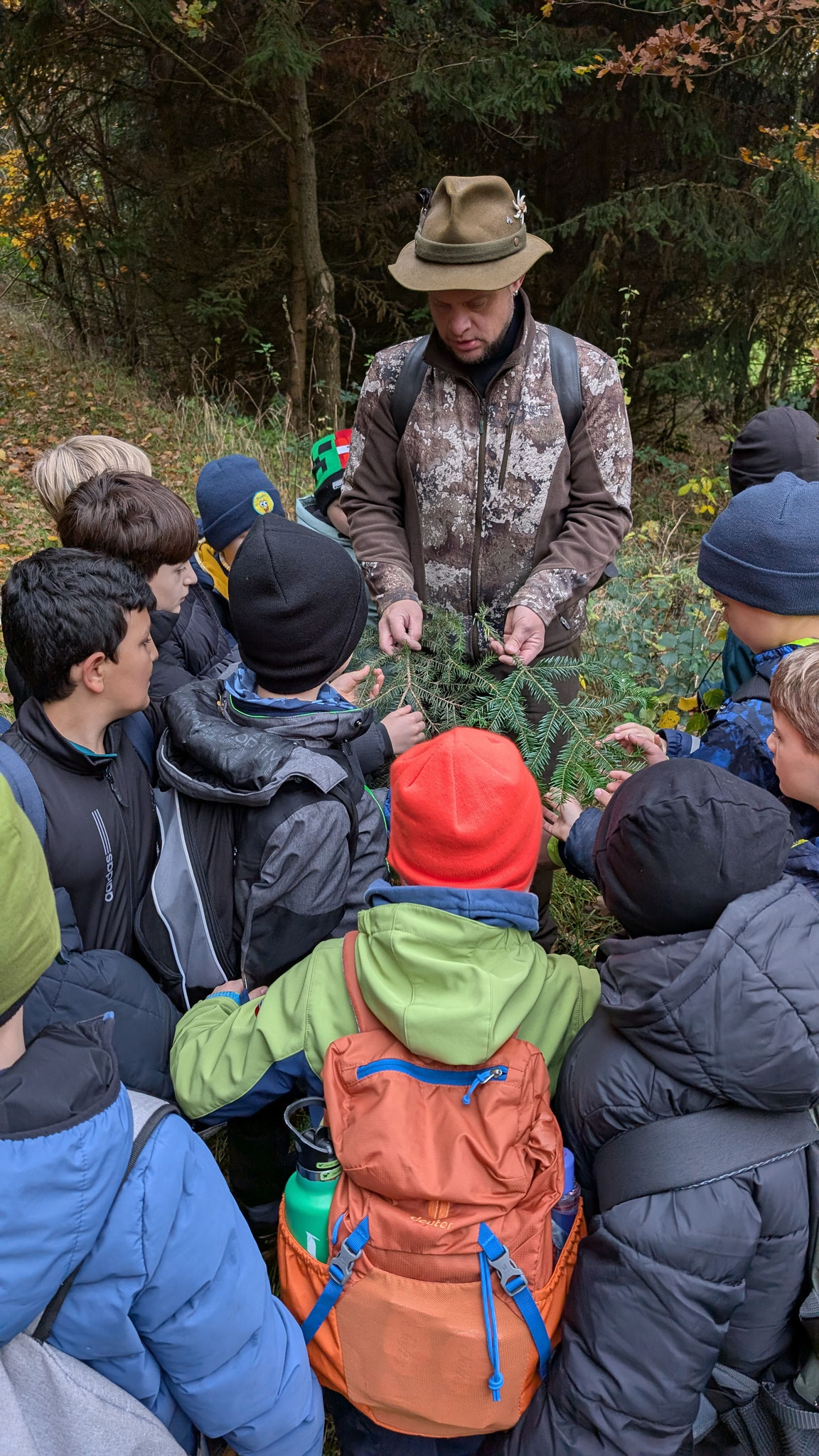 Während der Führung lernten die Schülerinnen und Schüler, verschiedene heimische Baumarten zu erkennen. Ob Fichte, Kiefer, Ahorn oder Eiche – die Kinder konnten dank vieler praktischer Beispiele die Unterschiede zwischen den Bäumen gut nachvollziehen. Besonders interessant war es, die Rinde und Blätter genau zu betrachten und die typischen Merkmale jeder Baumart kennenzulernen.