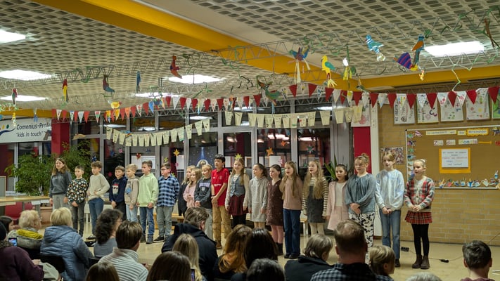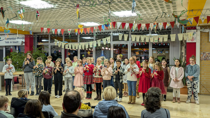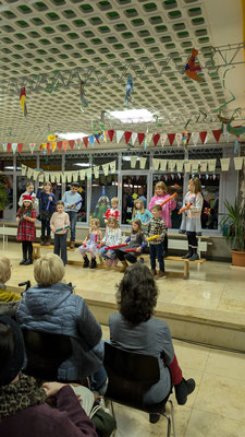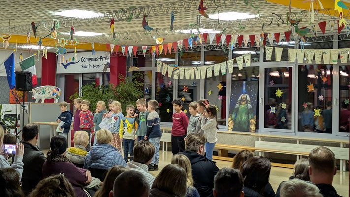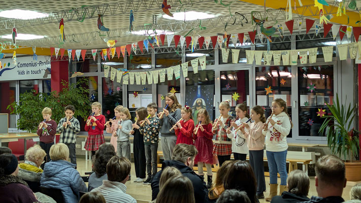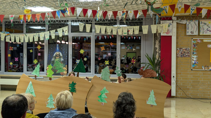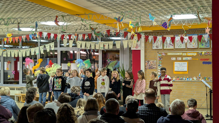 Alle Klassen präsentierten nacheinander ein abwechslungsreiches Programm auf der Bühne. Die Klassen 1a und 2a trugen jeweils ein Gedicht vor. Die Klasse 2b begeisterte das Publikum mit einem Lied, das durch eine passende Tanzdarbietung ergänzt wurde. Ein besonderes Highlight war das Theaterstück der Klasse 3a, das mit liebevoll gestalteten Stabfiguren aufgeführt wurde. Die Klasse 3b begleitete ein Lied rhythmisch mit Boomwhackern. Den musikalischen Rahmen des gesamten Abends gestaltete die 4. Klasse als Chor. Zusätzlich bereicherten die Flötenkinder das Programm mit zwei stimmungsvollen Liedern.